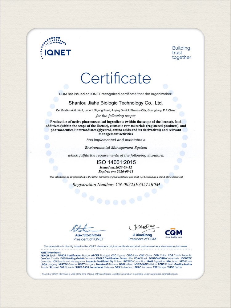 汕頭佳禾生物科技有限公司是一家致力于氨基酸及其衍生物研發、生產和銷售的國家高新技術企業,先后通過了國家藥品GMP認證,ISO9001質量體系認證、ISO14001環境管理體系認證。目前,公司擁有“廣東省專精特新中小企業”、“廣東省氨基酸產品工程技術研究中心”、“汕頭市生物發酵工程技術研究開發中心”、“汕頭市知識產權優勢企業”、“多項國家發明專利”、“廣東省守合同重信用企業”等多項資質和榮譽,旗下“佳禾牌”系列產品已成為原料藥行業知名品牌。 新泰市佳禾生物科技有限公司成立于2012年8月,注冊資金2億元,公司位于山東泰安新泰市新汶工業園區,是國 家級高新技術企業、山東省“專精特新”企業、山東省制造業單項冠軍企業、泰安市科技型中小企業、泰安市農業產業化龍頭企業、中國生物發酵產業協會理事單位。